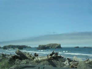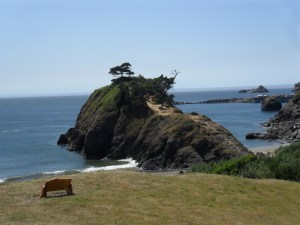 Port Orford was too gorgeous to pass up, but very windy. The sea stacks were amid the bluest water I’d ever seen. The waves were calmer than they were at Brandon. There was luscious green grass in some places as well. Took pictures there and down the road at Gold Beach, Cape Sebastian, and Whaleshead. We stopped at one and Daddy got me as close to the water as he could and Mom walked out to the water with me so I could get my