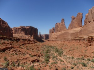 After leaving the Arches we drove through Red Cliff Canyon. The sides of the cliff jutted out into the road. It looked like we were going to hit the side of the cliff a few times. The cliffs were beautiful with a variety of colors distinguishing each layer. Eventually, my camera died and I had to take pictures with Daddy’s camera and mom took a few as well.
